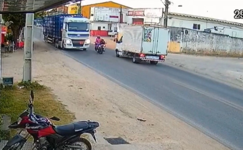 Nas imagens é possível perceber que, logo após o impacto, um dos motociclistas quase foi atropelado por um caminhão que passava pelo local.